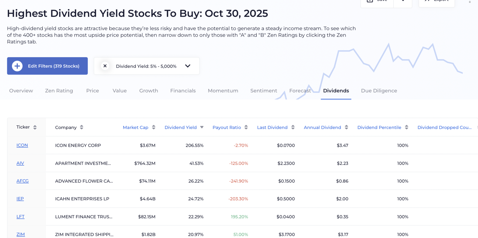This screener ranks stocks by dividend yield, but unlike most screeners, it also displays Zen Ratings — WallStreetZen’s proprietary quality metric that evaluates a company’s financial strength, growth, and valuation.