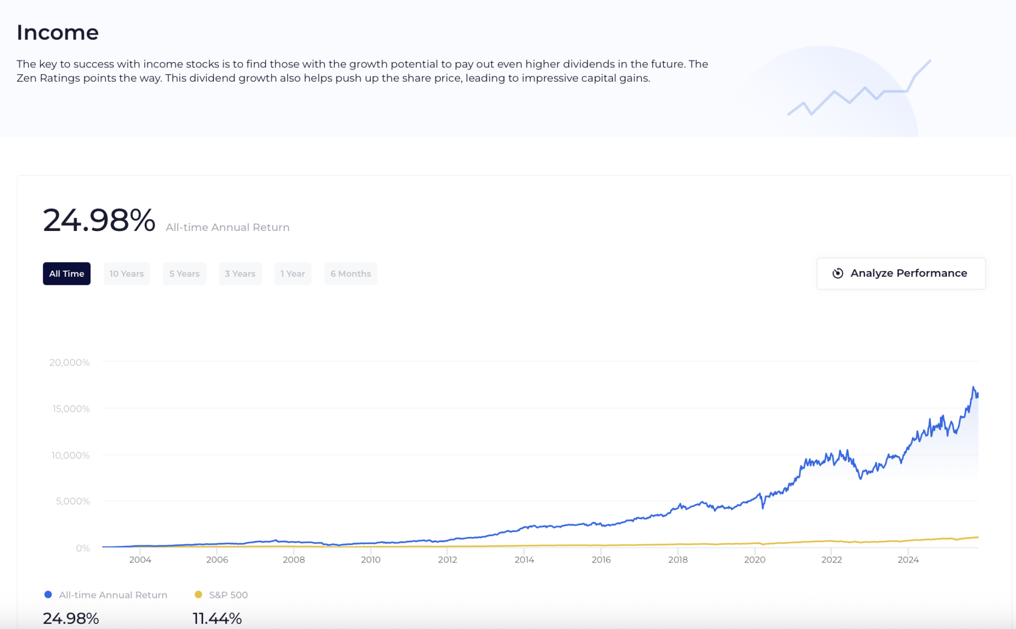 The Income Strategy Page inside WallStreetZen’s Zen Strategies is a curated, backtested dividend portfolio designed to highlight companies with sustainable payouts and strong growth potential — the kind of income stocks most likely to keep raising dividends over time.