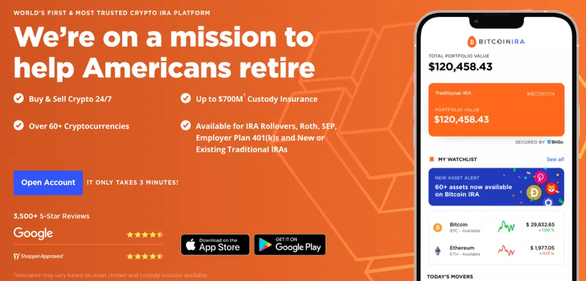 Bitcoin IRA has more than 170,000 clients, making it the largest crypto IRA platform. Clients can trade crypto 24/7, be confident in its industry-leading asset protection, and use its intuitive mobile app available for Android and Apple devices.