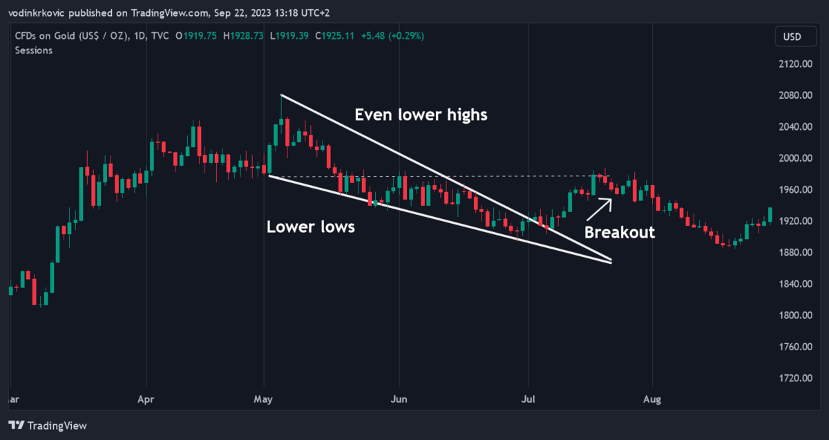 The upper trendline is formed by connecting lower highs, and the lower trendline is formed by connecting lower lows.