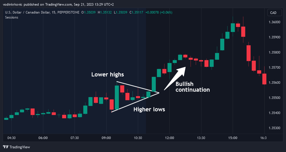 This pattern suggests that buyers are more aggressive than sellers and that the price is likely to break out to the upside.