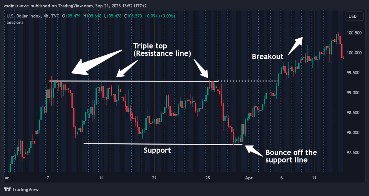 The Triple Top Breakout is a bullish reversal pattern that forms after a period of consolidation or range-bound trading.