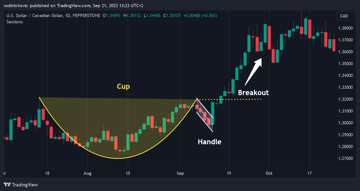 The pattern is confirmed when the price breaks out of the handle’s resistance line.