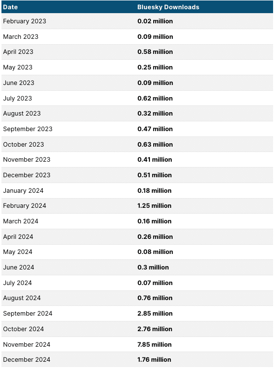 For instance, Bluesky downloads peaked at 7.85 million in November 2024. In fact, in the last six months of 2024 its downloads stood at 16 million, up from 2.23 million in the first half of the last year.