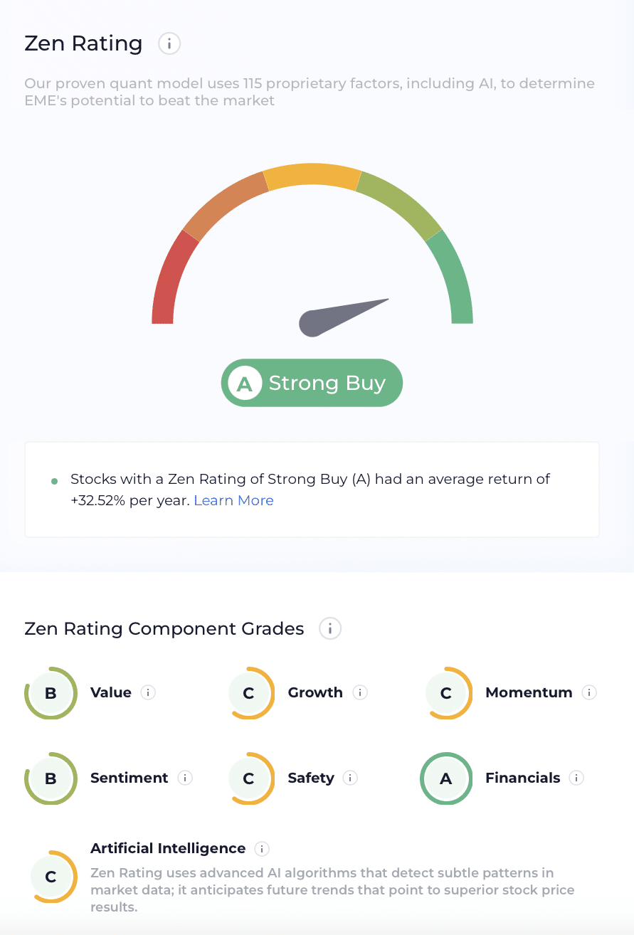 One recent winner from the Zen Investor portfolio? Emcor Group (NYSE: EME), which is currently up 27% since it was initially alerted — see its Zen Rating below.