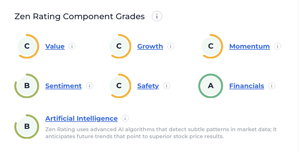 Zen Ratings is our proprietary ratings system that distills 115 factors proven to drive stock growth into a simple, easy-to-read letter grade. All you have to do is enter a ticker in the WallStreetZen homepage and you’ll see the stock’s overall grade. The grades are A-F, with A being the highest (Strong Buy) … just like in school.