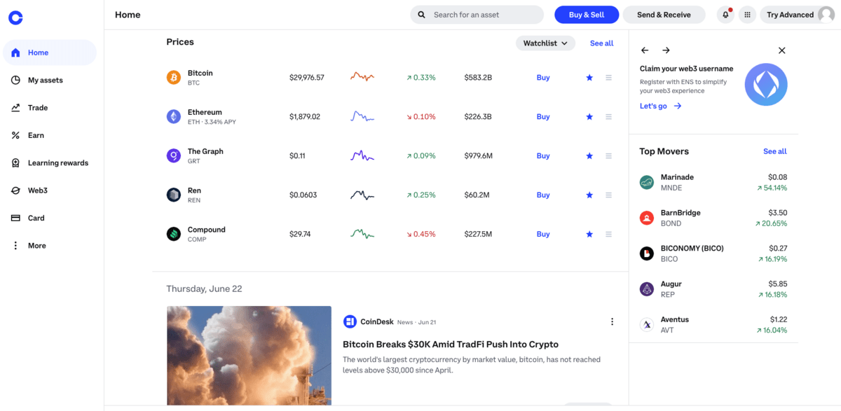 The Coinbase mobile is one of the best around for beginners, with a slick user interface that makes it easy to browse and trade crypto and earn interest through staking and the Coinbase Earn program.
